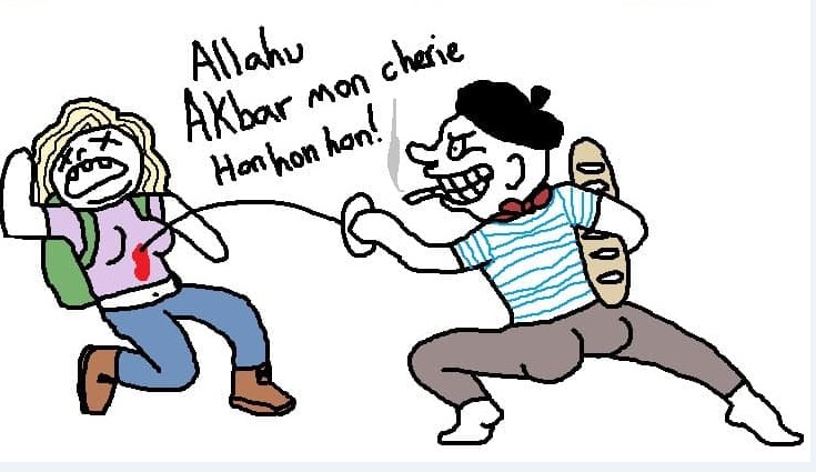 The BBC report, from which the above is quoted and taken from French reports, is very restrained. For instance, they managed to avoid adding their own phrases such as ‘the motive is currently unknown’, ‘experts have warned against a far-right backlash’ and ‘commentators have expressed concern that such events could lead to an uptake in support for Marine Le Pen’.