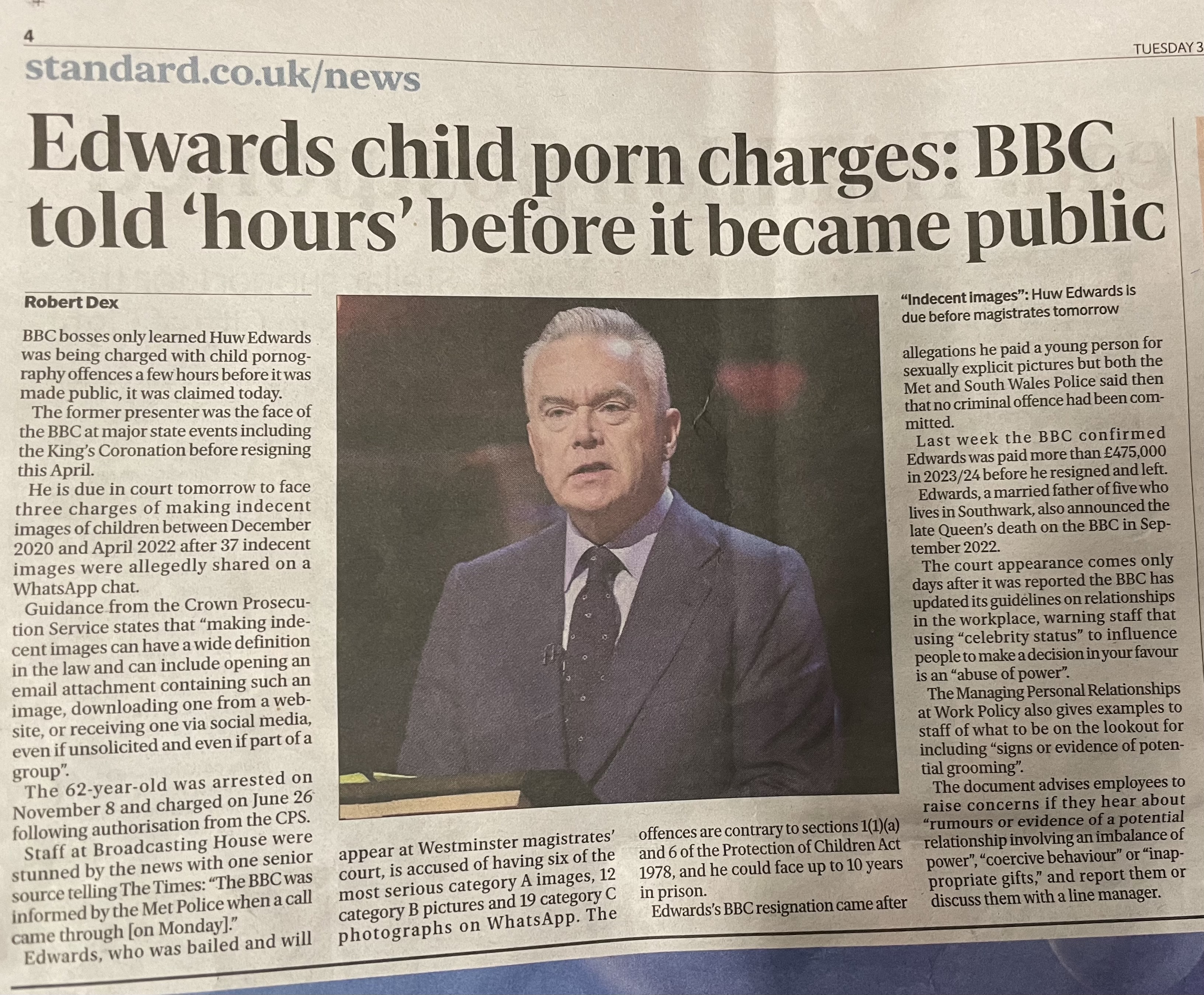 No , not anything to do with Parliament, but Westminister Magistrates Court……A big day for BBC “talent” Huw Edwards, who we are all pleased to see has returned to health and is fit to be tried. That does pose a question ..Will he enter guilty pleas?